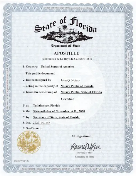 En el tiempo seleccionado, recibirá su documento con la apostilla, que es un sello de tamaño A4 que se ve como a continuación, emitido por el estado de la florida: